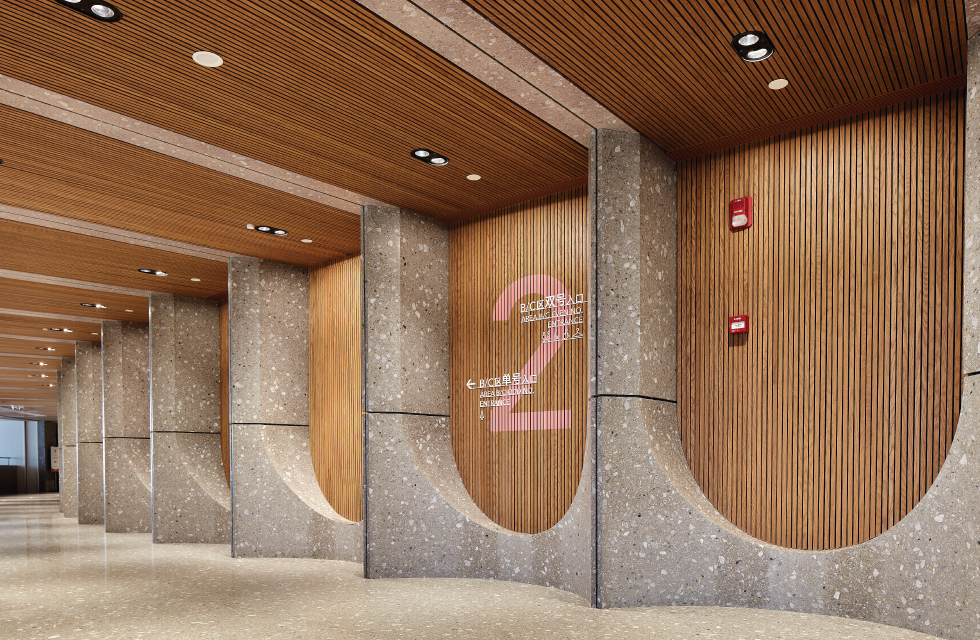 在大劇院場外的挑高回廊,WAC在原有的Plana Pro系列筒燈基礎(chǔ)上為項目特別定制了兩款筒燈。走道頂部,定制款雙頭筒燈實現(xiàn)了下照+洗墻的二合一,既能保證走道的功能性照明需求,同時墻壁細節(jié)的紋路設(shè)計等在均勻的洗墻光線下,更顯溫潤的美感。