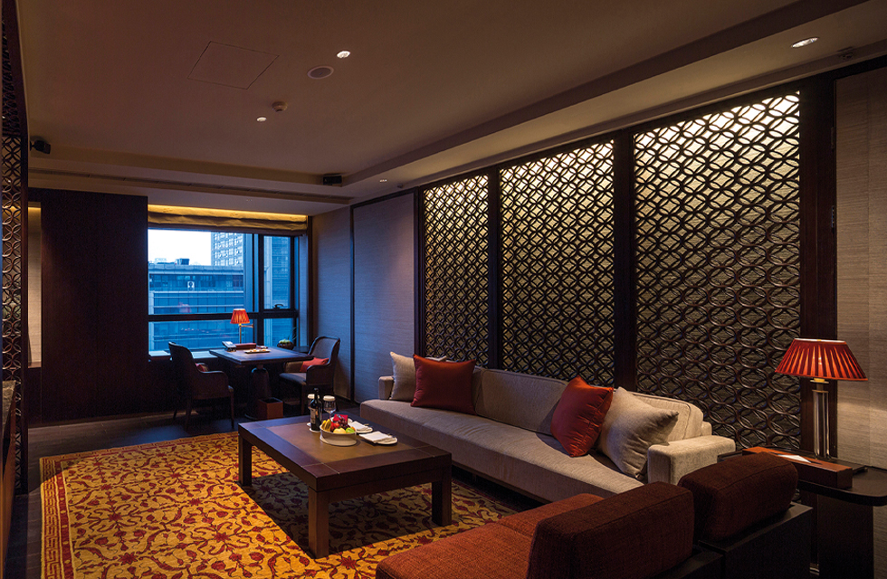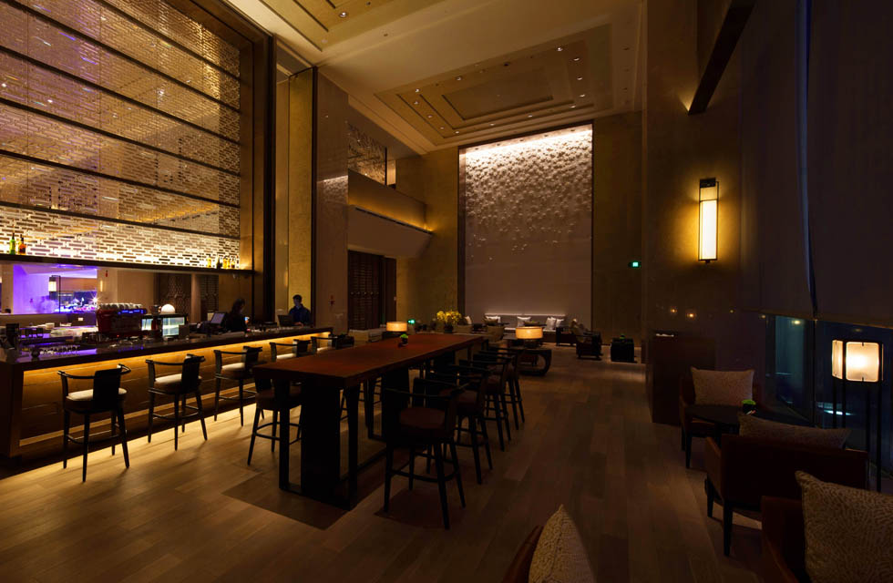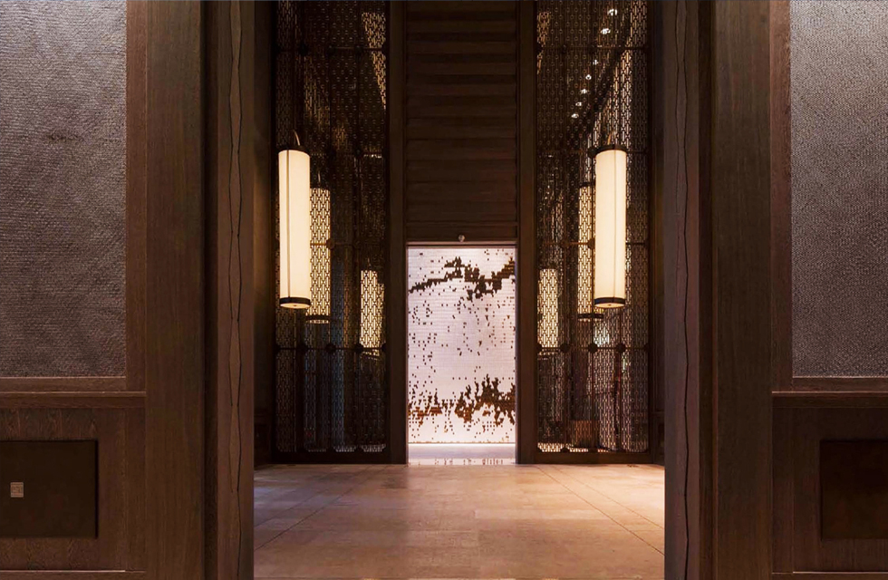 進入大堂,不同的功能區(qū)域用中式傳統(tǒng)屏風隔開,燈光明暗的對比更刻畫出傳統(tǒng)的空間秩序感。通過對空間各處亮度的規(guī)劃安排,目光自然地將來訪者引入宅院的深處。