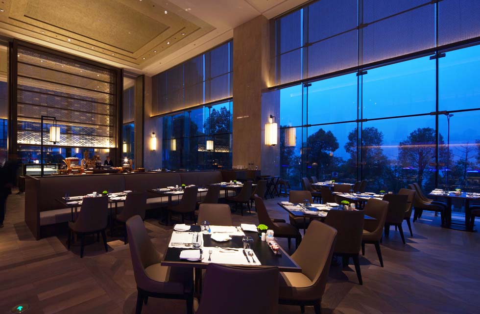 酒店的全日餐廳緊鄰嘉陵江,是上佳的觀景點,然而巨幅落地玻璃通常都會反射室內(nèi)的光源,對夜景觀賞造成困擾。為此,設(shè)計師特別注重控制垂直面上的亮度,尤其是避免使用發(fā)光面過亮的燈具,并且盡量減少燈具的數(shù)量。為此特意選用了WAC Lighting專為酒店設(shè)計的ELANA Pro系列筒燈。其具備專利設(shè)計的隱光技術(shù),以及優(yōu)秀的出光效果很好的解決了這一問題。最終提供了內(nèi)外交融的夜間光環(huán)境,為來訪者創(chuàng)造了一個得以盡情欣賞對岸美景的機會。