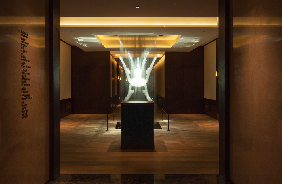 設(shè)計團隊將出土于巴渝的經(jīng)典文物“鳥形尊”以現(xiàn)代美學設(shè)計呈現(xiàn)在中餐廳入口。照明設(shè)計師用低色溫漫反射光形成環(huán)境氛圍,同時采用高色溫的燈光將這個水晶藝術(shù)品的晶瑩剔透最大程度的凸顯。與此同時,直射向藝術(shù)品的強光特意避開來訪者接近的方向。