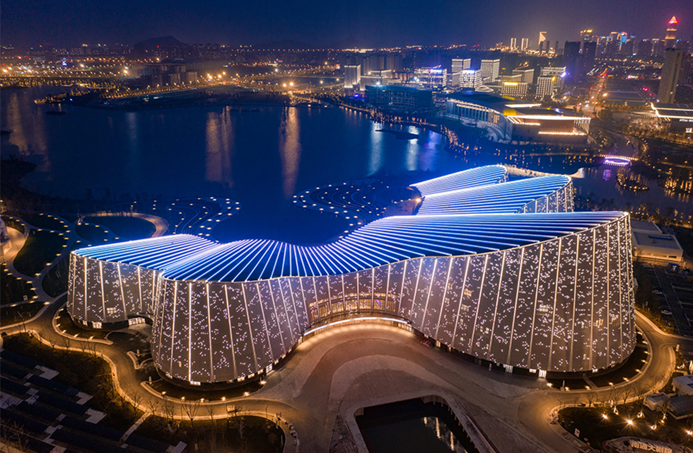 在南通中創(chuàng)區(qū)紫瑯湖畔東側(cè),坐落一個總建筑面積逾11萬平方米,體量位列國內(nèi)前五的“超級文藝殿堂”,更是世界當代浪漫主義建筑大師保羅·安德魯?shù)慕^筆之作。她是一顆“南通明珠”,神秘而璀璨,光文化與城市貫通的媒介,整個夜間的感受如同行云流水,光影變幻,城市名片,水光一色。