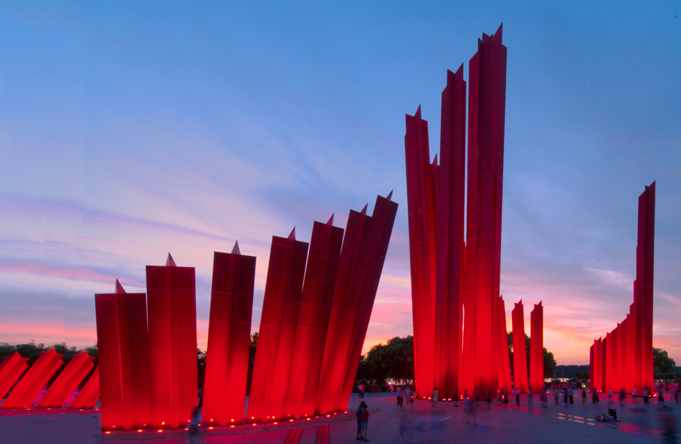 49顆紅色五角星連同49根大型紅色立柱在江邊閃耀,猶如燈塔一般指引著革命者奮勇向前,又似連天烽火,讓人們追憶起70年前那段崢嶸歲月,追憶起百萬雄師過大江的雄風(fēng)與豪情