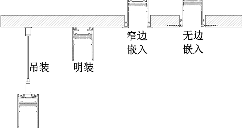 懸吊/吸頂明裝/窄邊嵌入/無邊嵌入