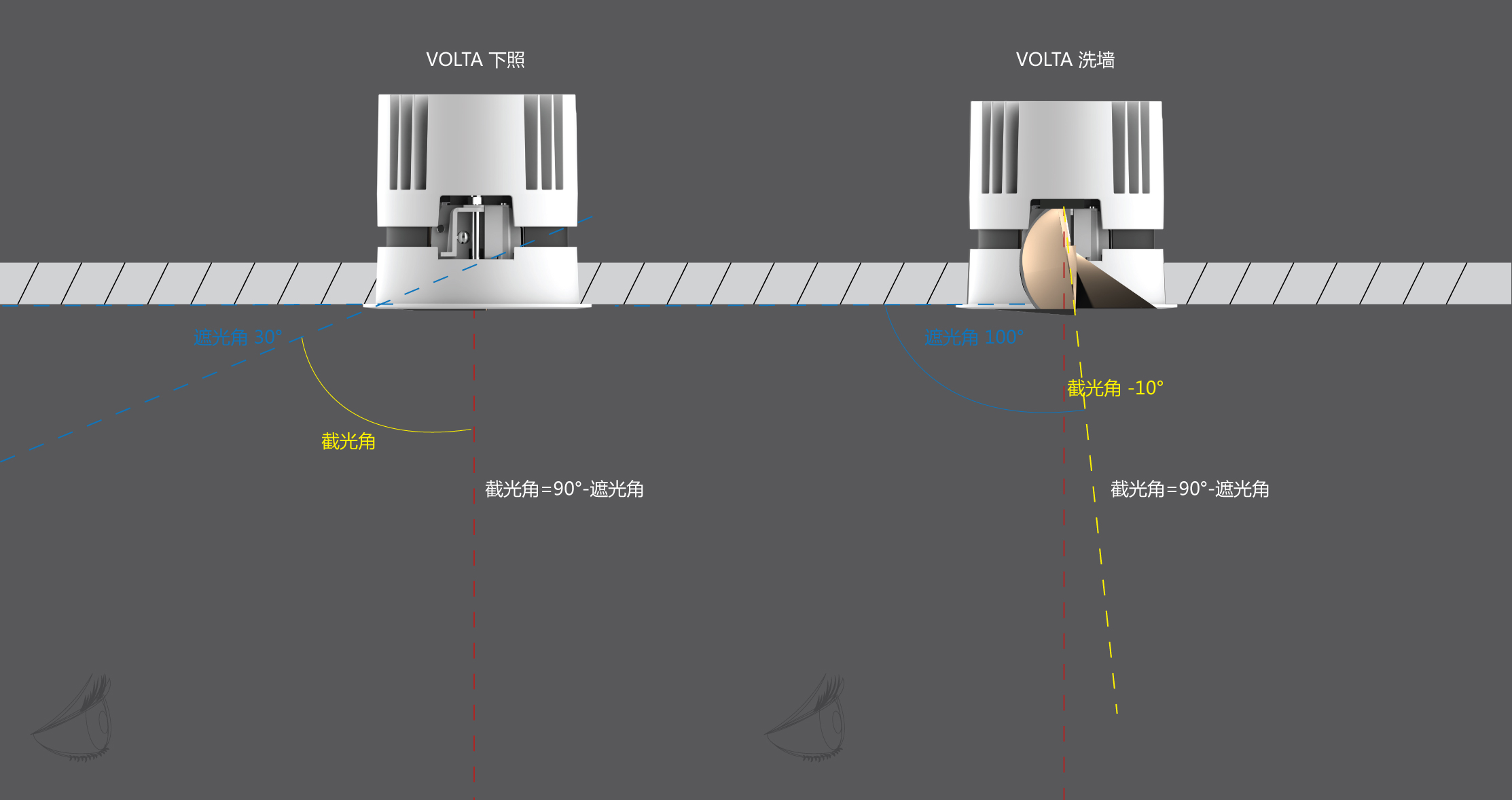 VOLTA洗墻系列燈具所引入的“負(fù)截光角”理念,它不僅僅是簡單地限制光線的擴(kuò)散,而是通過更為復(fù)雜和精細(xì)的光學(xué)設(shè)計,實現(xiàn)了“-10° 截光角”,確保了光線在投射過程中的最大化輸出,減少光損,確保照明的質(zhì)量,同時在最大范圍內(nèi)保證了人眼不會受到直接眩光的影響。