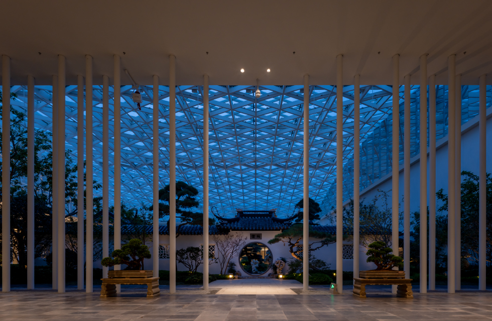 西園外圍,MINI FLOOD IV 線條燈均勻打亮立柱,垂直光線沿立柱縱向延伸,多根立柱的光影呈現(xiàn)明暗交錯的層次感,與中式寫意的蘇園形成呼應(yīng),東西并茂。