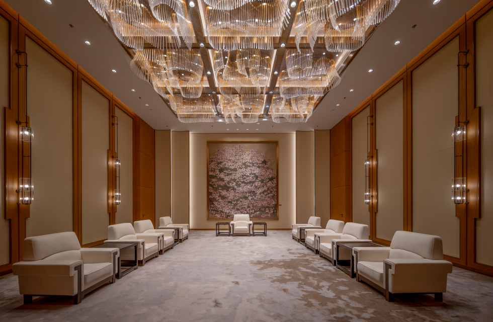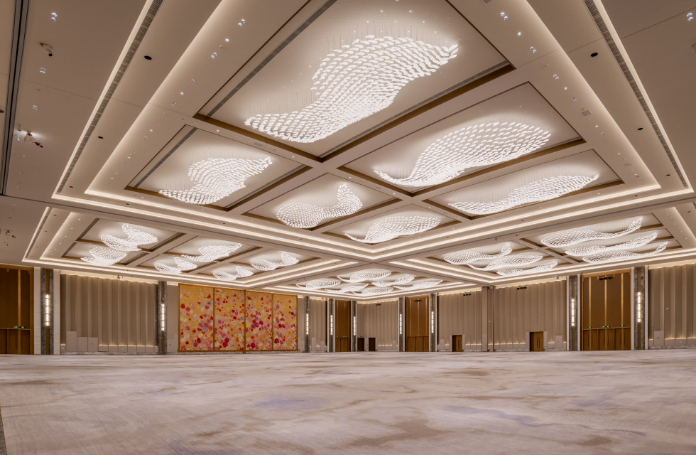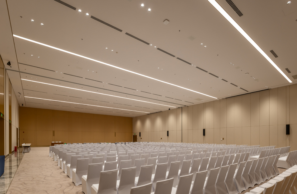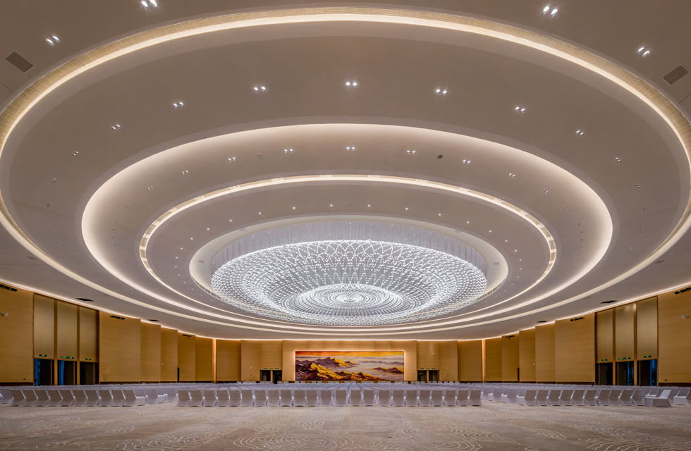 峰會廳以空間中心為原點(diǎn),筒燈向外圈逐次散開,天花燈帶巧妙排布,精準(zhǔn)呈現(xiàn)“天圓地方”的設(shè)計形態(tài)。宴會廳采用 VOLTA 筒燈確保整體空間光線充足,再將燈帶融入天花,為宴會廳打造雅致格調(diào)。