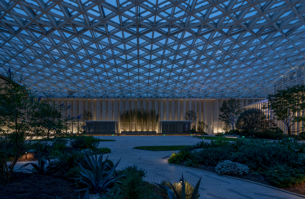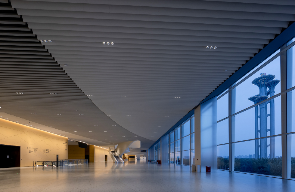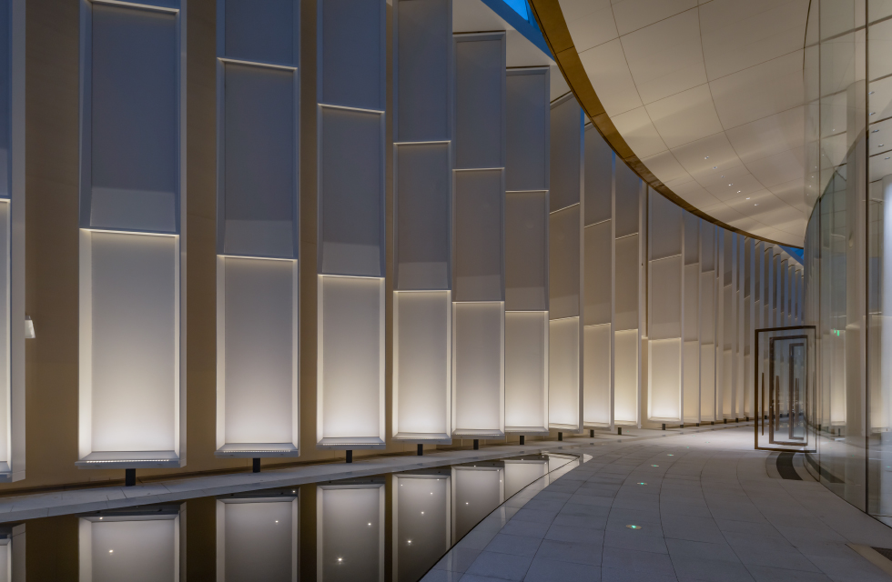 序廳為貫通三層、連續(xù)通高的寬闊走廊,呼應(yīng)整體建筑“開放”的設(shè)計理念,獨(dú)特的“鳥窗”設(shè)計與外立面玻璃巧妙引入自然光線,讓室內(nèi)外光影自然交融。為適配序廳天花格柵的結(jié)構(gòu)要求,WAC 定制專屬支架,?實(shí)現(xiàn) PLANA PRO 系列下照及洗墻筒燈的創(chuàng)新式安裝,該方案既滿足了序廳的基礎(chǔ)照明需求,又以均勻的光線鋪滿墻面,使得整個空間開闊通透、溫馨自然。
