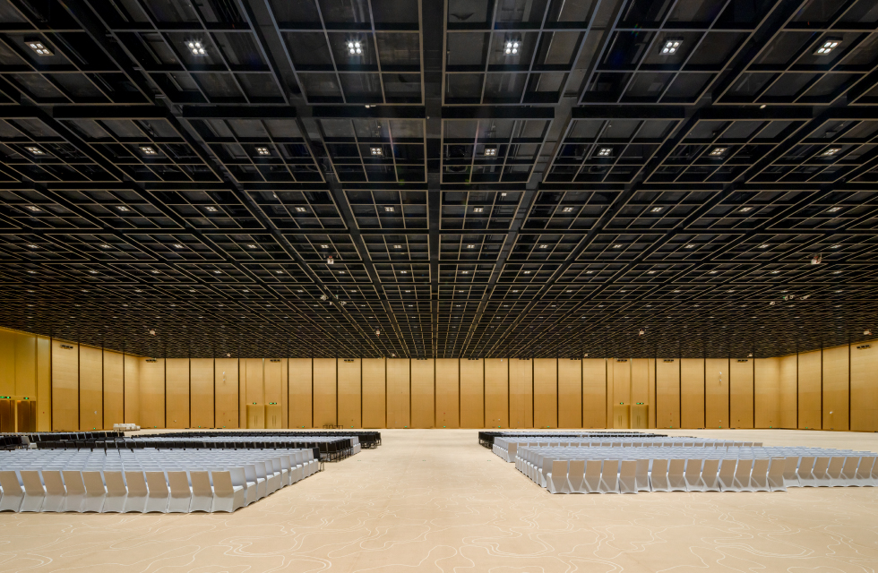 主會廳長105米,寬70米,總面積近 7500平方米,高度近12米,超高挑高和超大空間尺度對基礎(chǔ)照明的充足性、均勻性有著嚴(yán)苛要求,針對這一需求,WAC 巧妙地將4款 VOLTA 筒燈統(tǒng)一嵌裝在同一箱體內(nèi),確保光線充足、覆蓋范圍精準(zhǔn),滿足超高空間的基礎(chǔ)照明需求,同時,箱體整合設(shè)計有效規(guī)避了單燈分散安裝可能造成的天花雜亂,保持整體空間的簡潔統(tǒng)一。