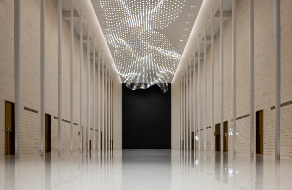 迎賓握手廳兩側(cè)立面高達(dá)26米,?VOLTA 系列筒燈均勻嵌入頂部天花板,規(guī)整的布局強(qiáng)化了空間秩序,高光效為整個空間營造明亮通透的氛圍。天花頂部特別選用 FALCON 軌道燈系列中不同光束角的洗墻燈與射燈,滿足了洗墻、泛光、窄光等多種照明需求,燈具沿天花連續(xù)排布,自然銜接無斷層,以光線串聯(lián)起空間中的每一處細(xì)節(jié)。