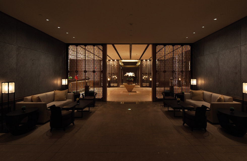 進入大堂,不同的功能區(qū)域用中式傳統(tǒng)屏風隔開,燈光明暗的對比更刻畫出傳統(tǒng)的空間秩序感。通過對空間各處亮度的規(guī)劃安排,目光自然地將來訪者引入宅院的深處。