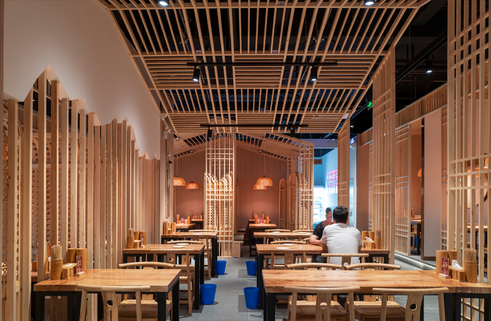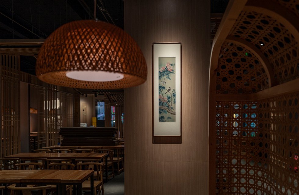 就餐區(qū)域在整體開放的格局基礎(chǔ)上,通過木制、編織等工藝形成虛實(shí)區(qū)域劃分,隱隱綽綽,與燈光交織演繹別樣迷人風(fēng)情。
