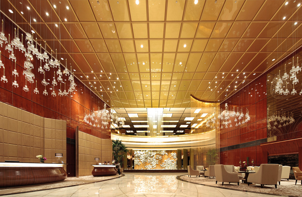 酒店暗朱紅的木質(zhì)墻壁中,嵌入LED展示燈,熨帖墻面錯落布局,散發(fā)出的妖嬈柔光如綻放的朵朵花瓣,釋放著夜的柔美芬芳。
