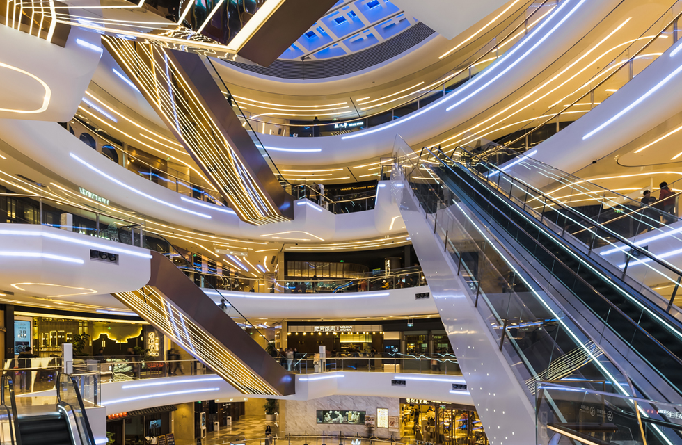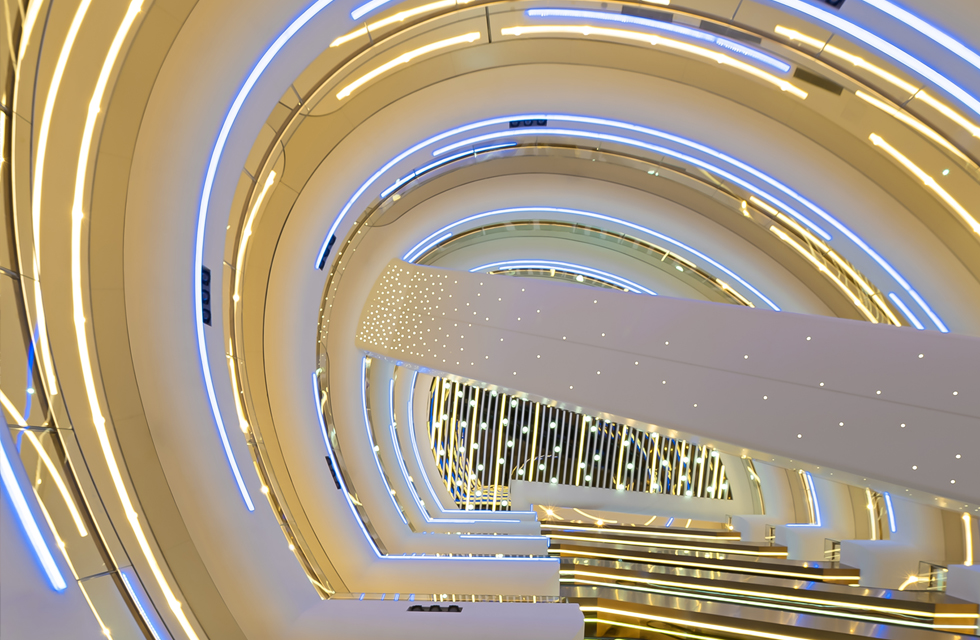 整個(gè)商場(chǎng)以“都市銀河”為設(shè)計(jì)概念,從中庭、穹頂、扶梯包裝上都可以看出銀河星空等元素。隨扶手樓梯緩緩而上,星空銀河盡在眼前,仿若手可摘星辰, 漫步其中,自在隨性、享受靜謐。