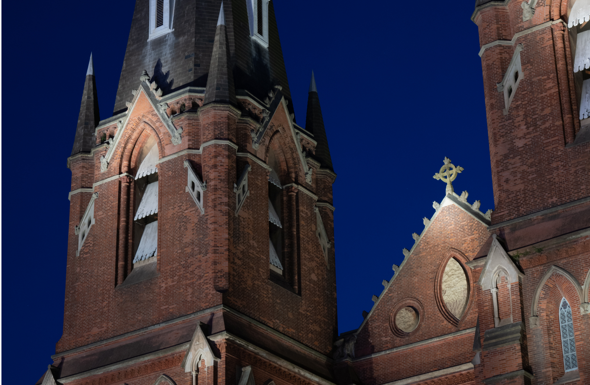 清光緒三十年(1904年)動(dòng)土興建,1910年9月大堂落成。整幢建筑高五層,磚木結(jié)構(gòu)。法國中世紀(jì)樣式。大堂頂部兩側(cè)是哥德式鐘樓,尖頂。高50米。大堂內(nèi)圣母抱小耶穌像立祭臺之巔,俯視全堂,為整座教堂之中心。教堂占地面積2670平方米,建筑面積6670平方米,可容納3000余人。